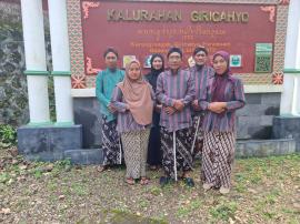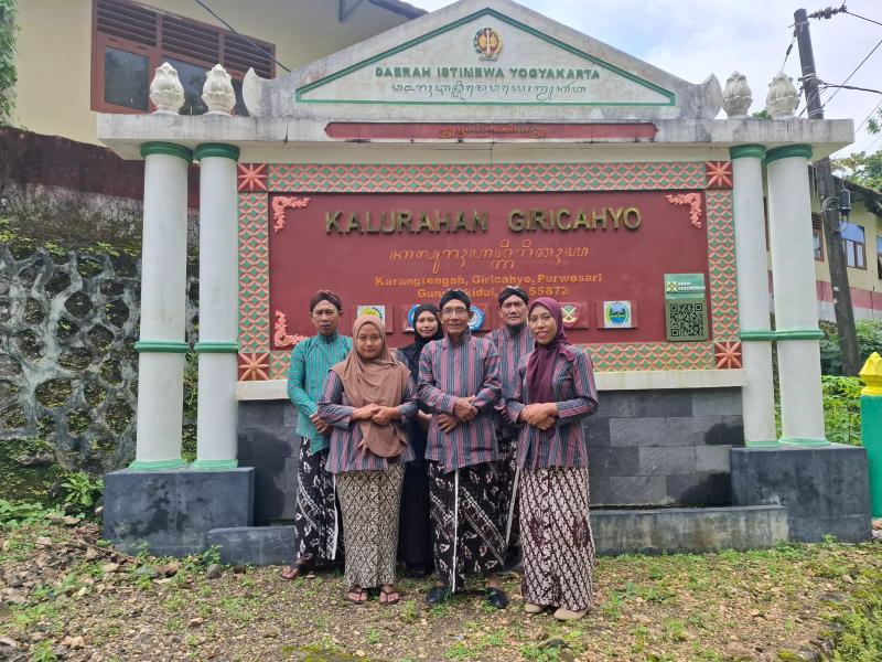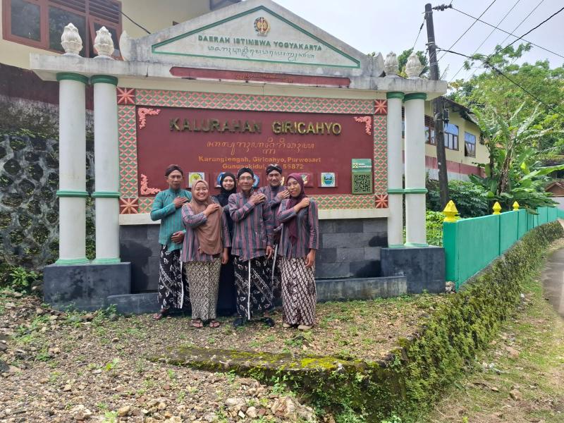 (SID-GC) - Kamis, 5 Februari 2026 bertepatan dengan hari Kamis Pon di mana Pamong Kalurahan Giricahyo mengenakan pakaian adat gagrak Yogyakarta sesuai SE yang diedarkan. Pamong berfoto bersama di depan papan penanda keistimewaan.