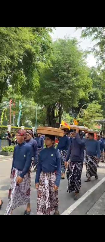 Dengan mengenakan busana Ageman Adat Jawa Gagrak Yogyakarta, yakni surjan lurik dengan dominasi warna biru yang elegan dipadukan dengan jarik parang serta blangkon, para pamong tampil anggun dan gagah, mewakili identitas masyarakat Yogyakarta yang santun dan berbudaya. Kekompakan ini menambah kehidmatan suasana perayaan di titik Nol km hingga area Pagelaran Keraton Yogyakarta.